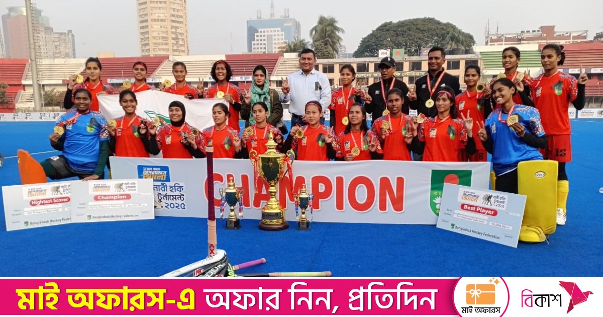 BKSP, representing Zone 5, clinched the title of the BRAC Bank Aparajeyo Alo Women’s Hockey Tournament after thrashing Zone 2 (Dhaka and Mymensingh) by 8–0 in the final at the Maulana Bhashani Hockey Stadium in the capital on Thursday.