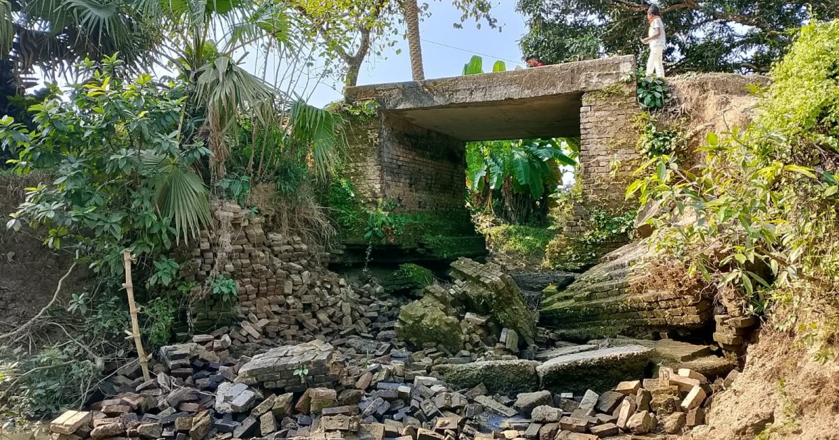 During a spot visit on Monday (December 29), it was seen that the lower sidewalls on both ends of the bridge had collapsed, with bricks scattered underneath. Nearly five years ago after the re-excavation of Serer Khal, strong currents washed away about one-third of the soil and bricks beneath the bridge. Despite this, residents of the two villages continue to use the bridge, risking their lives.