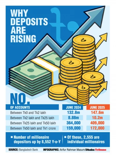 Similarly, accounts of Tk2-Tk25 lakh were 8.88 million last year but 10.2 million in June this year. Accounts of Tk25-Tk50 lakh were 364,000 in June last year but 409,000 this year, while accounts with Tk50 lakh-Tk1 crore were 159,000 in June 2024, but this June it was 172,000.