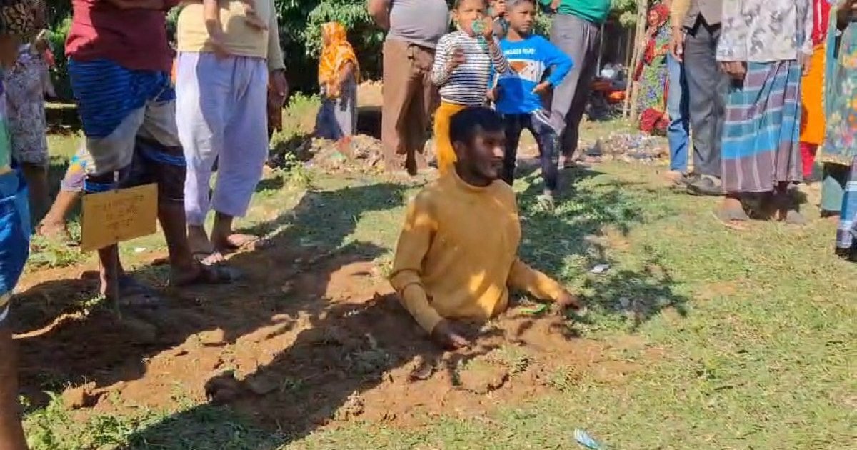 Locals in Sreepur, Gazipur, on Saturday buried a 26-year-old man in a waist-deep pit after he allegedly beat his mother during a dispute over money, police said.