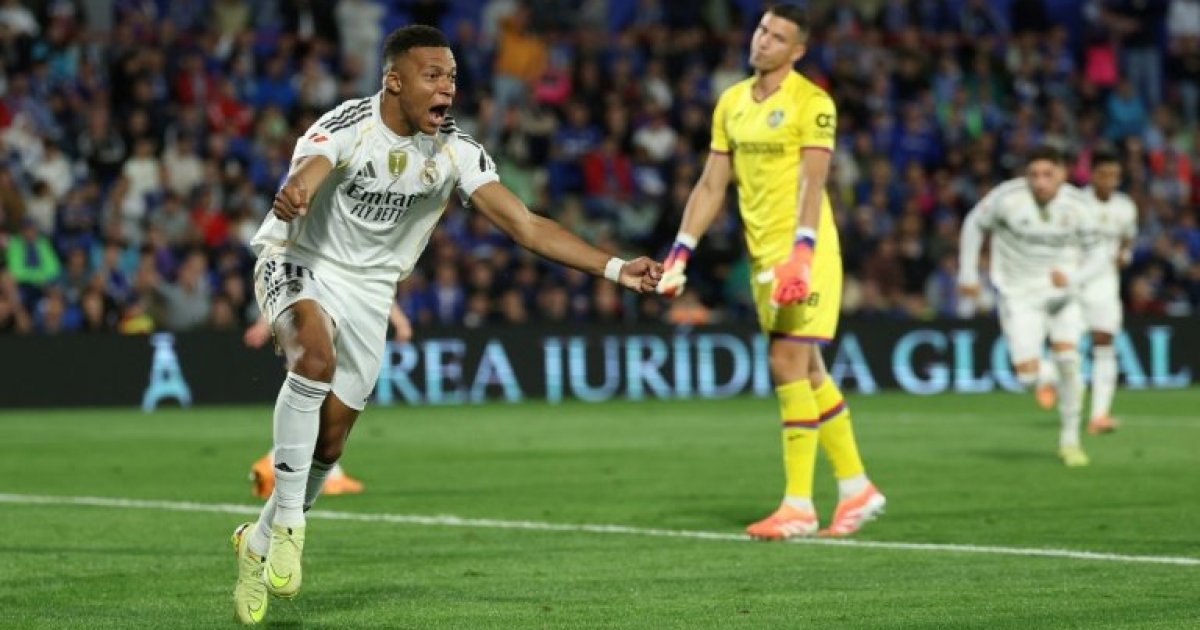 Kylian Mbappe extended his goalscoring streak to 11 consecutive games to help Real Madrid reclaim top spot in La Liga with a 1-0 victory at nine-man Getafe on Sunday.