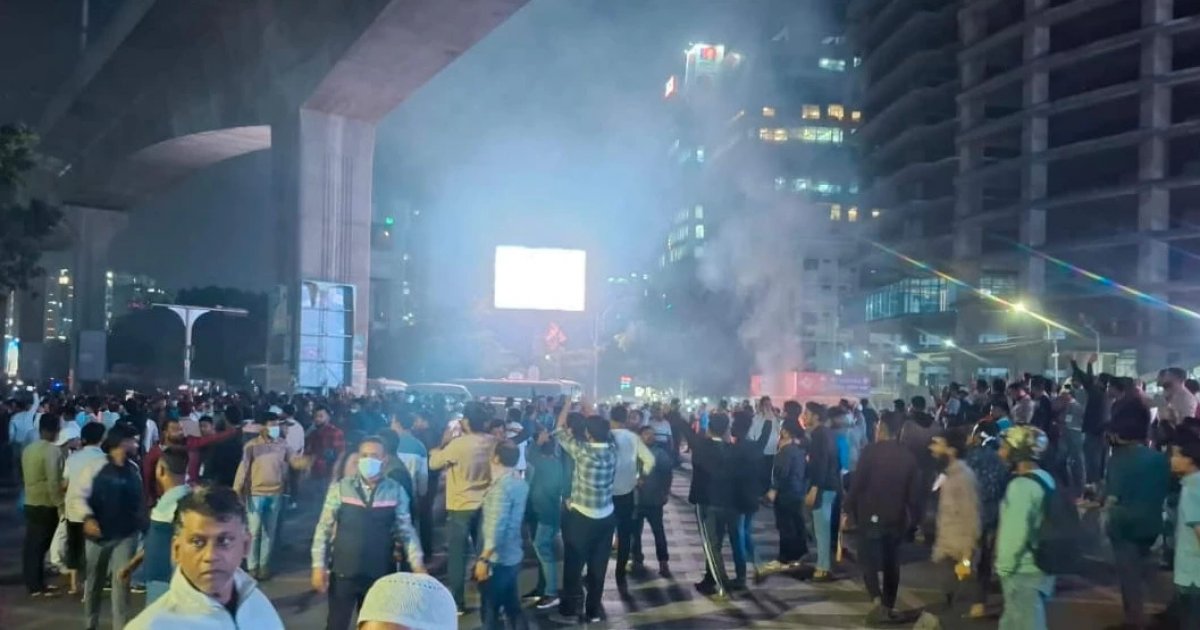 Witnesses said the protesting traders gathered at the Karwan Bazar roundabout shortly after evening and began protesting by setting fire on the road.
