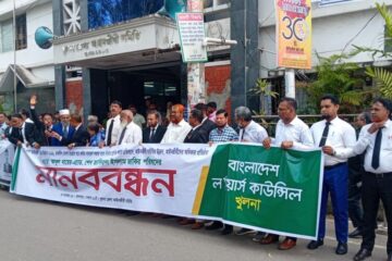 Members of the Bangladesh Lawyers Council (backed by Bangladesh Jamaat-e-Islami) and the Independent Lawyers Council here in Khulna district formed a human chain on Monday, demanding withdrawal of the suspension…