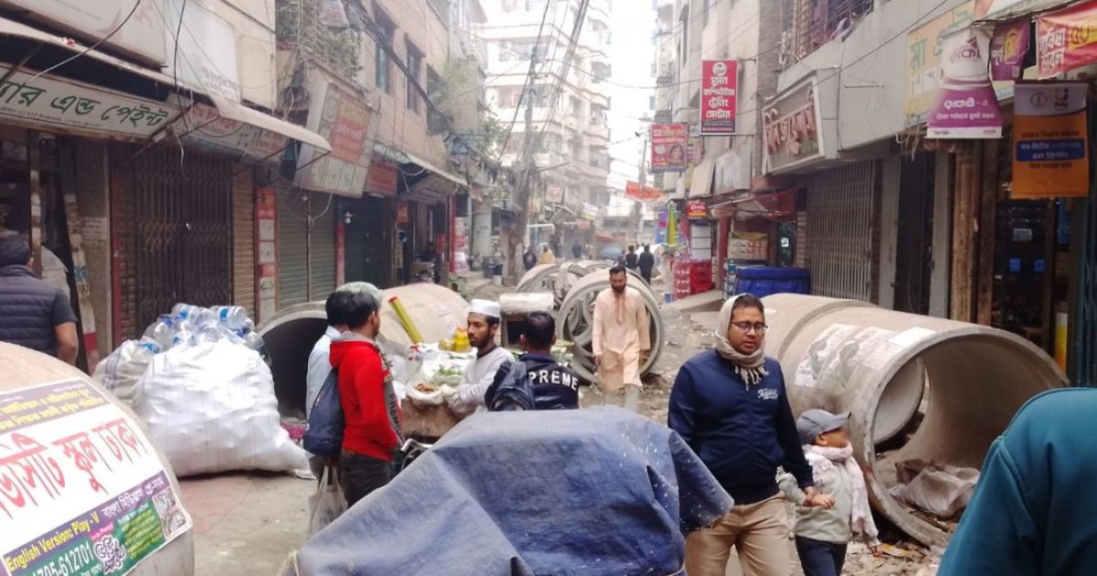 Rice trader Nuru Mia said work began three months ago but has remained halted for the past two months. “Movement has become extremely difficult and our business has come to a standstill. Stagnant water has created unhygienic conditions and increased mosquito breeding. The foul smell also spreads germs,” he said.