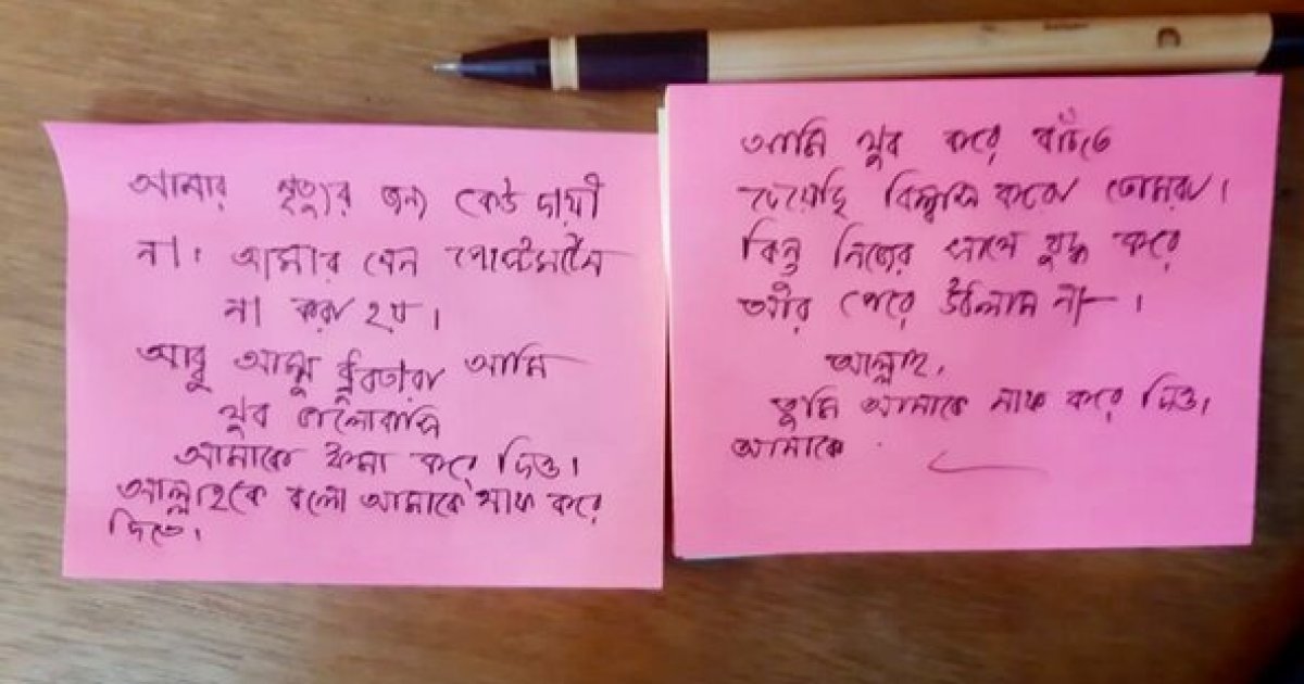 “No one is responsible for my death. Please do not conduct a post-mortem. Amma, Abbu, Dhrubatara — I love you all very much. Please forgive me. Ask Allah to forgive me too.”