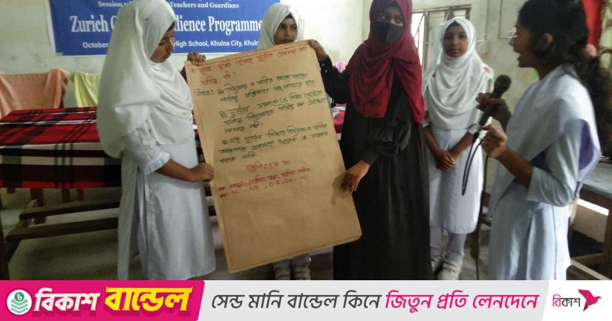 Rupsha High School in Khulna hosted a climate awareness program on Friday under the Zurich Climate Resilience Program to educate students about climate change and disaster preparedness through discussions, art, group activities, and a quiz.